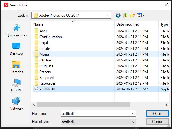 Chọn file amtlib.dll ở đường dẫn: C:\Program Files\Adobe\Adobe Photoshop CC 2017