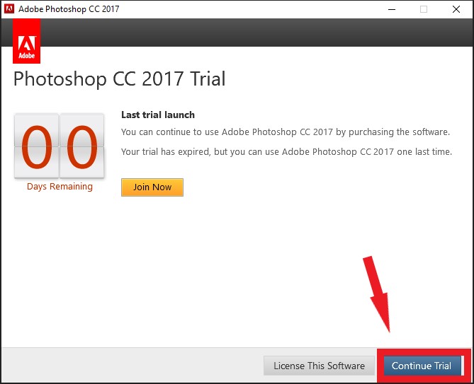 Nếu Continue Trial sáng thì bấm chọn
